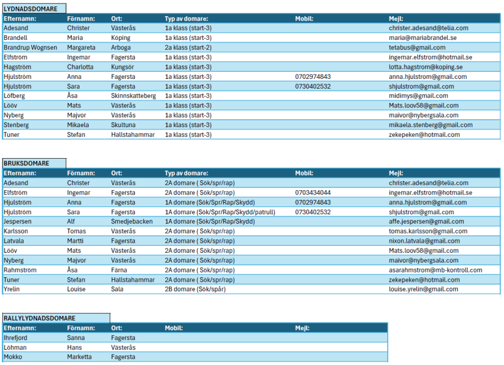 Här är även länkar till domarlistan: PDF EXCEL (välj rätt flik i excel, alla funkisar är med i den) OBS! Meddela Christer Adesand om ”typ av domare” inte stämmer, om ni får döma fler eller färre i ex brukset, eller om ni är 1a klass domare i lydnad. (detta går ej att se i SBK Tävling)